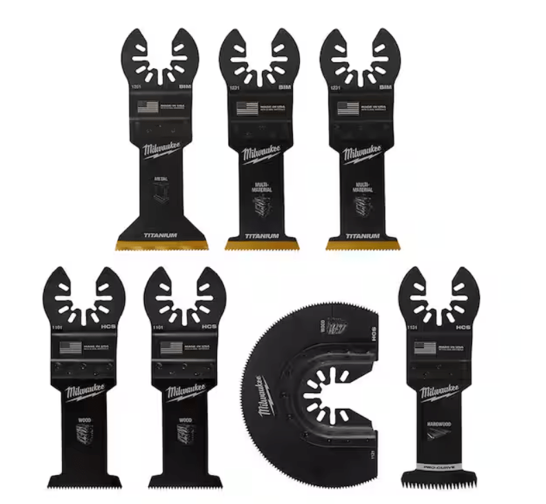 The MILWAUKEE Universal Fit OPEN-LOK 7-Piece Oscillating Multi-Tool Blade Variety Set offers users an assortment of blades for multiple applications. The Titanium Enhanced Bi-Metal Blade uses premium high-speed steel and lasts up to 15X longer than standard high carbon steel blades. This oscillating multi-tool blade set includes a bi-metal blade ideal for soft metals and two for smooth cuts in wood and nails, PVC, and drywall. The Japanese Tooth blade features PRO-CURVE for fast, clean cuts and greater control in hardwood, clean wood, PVC, and drywall. The oscillating wood blades have aggressive, precision ground teeth for fast cuts in wood, drywall, and PVC. The 3-1/2 in. round segmented wood blade is great for users making longer straight cuts that don't require a deep cut depth. This Milwaukee multi-tool blade set is designed with global materials.